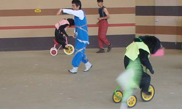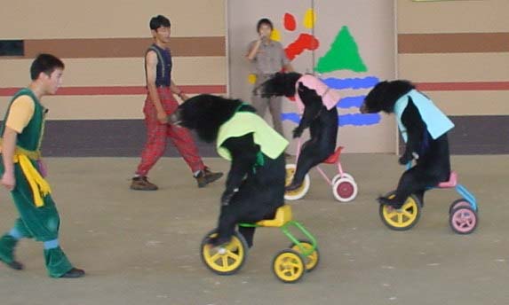 三輪車での競争です。1着当てると賞品 なわとび、三輪車を披露してくれた熊さんは 1番手前のグリーンのエプロンの子です |